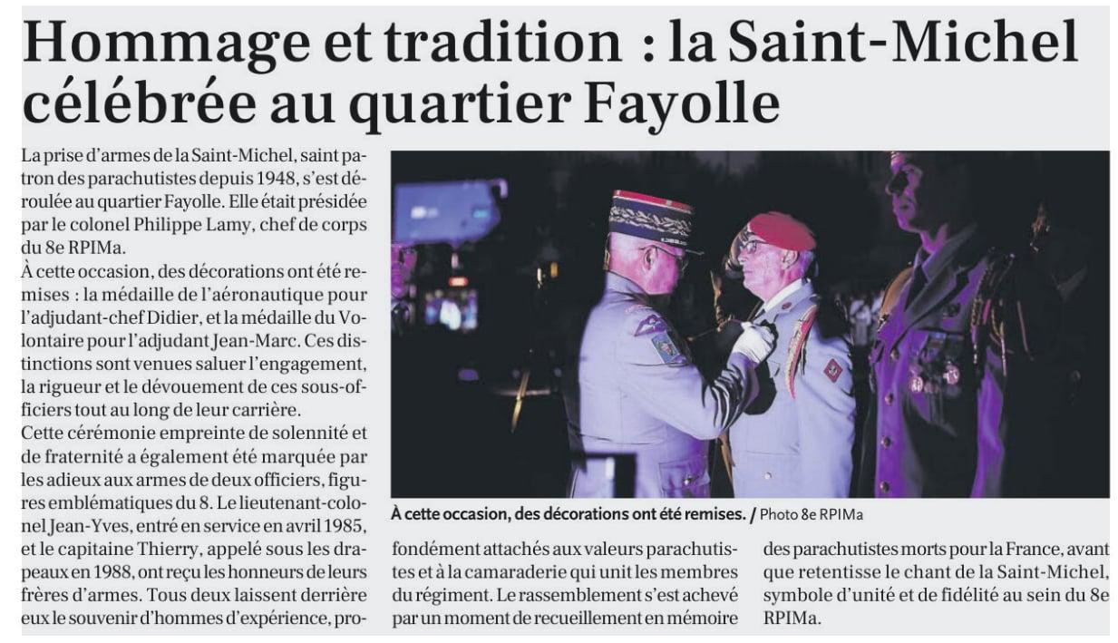 Bonjour. - Ancien pilote d'hélicoptères en Algérie, puis pilote sur NORD 2501, et ensuite sur C160 TRANSALL à Orléans, j'ai eu énormément parachuté du personnel, ainsi que que des palettes en largage lourd, j'ai toujours gardé une pensée pour vous tous, en ce jour de la Saint Michel, votre patron. - A la retraite depuis 1980, j'ai conservé l'esprit aviateur, à 92 ans. - Je vous ai aussi transporté, ou parachuté un peu partout en Afrique, lors de mes séjours au Tchad, et à Djibouti, ou en détachements dans de nombreux pays, tel le Sénégal, et la Mauritanie. - J'ai personnellement connu le commandant, et plus tard général Bigeard, et ceux du commando Georges. - Recevez mes très sincères amitiés. - HAAS Charles